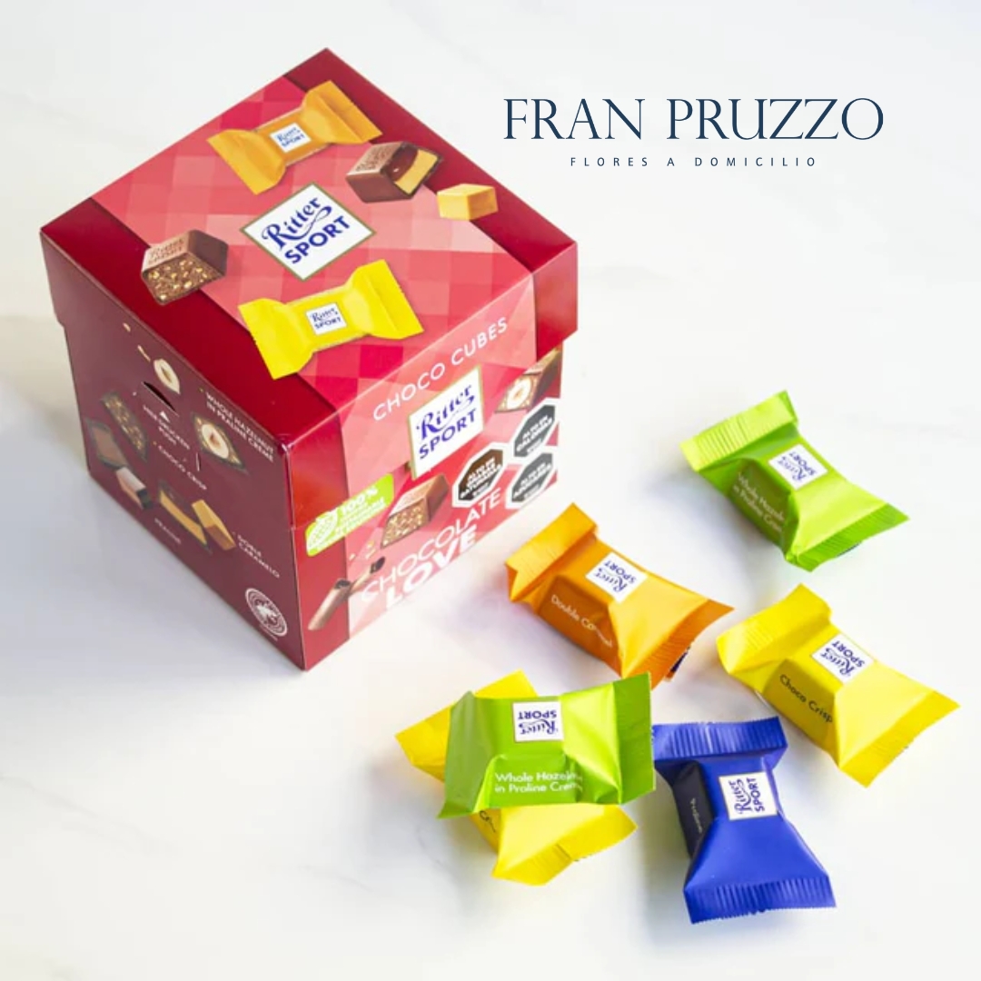 RITTER SPORT CHOCO CUBES es un elegante envase todo en uno para regalar a tu familia y amigos. Prueba las cuatro variedades: praliné, caramelo, nueces en una crema de praliné y chocolate crujiente.